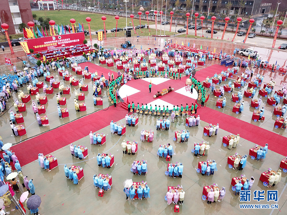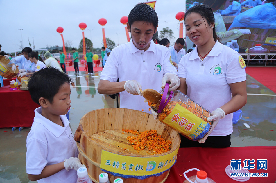 湖南衡東“同剁黃貢椒”成功挑戰(zhàn)基尼斯紀錄 彭斌 攝 560斤三樟黃貢椒、560斤米酒、112斤食鹽......20日上午,湖南省衡陽市衡東縣第四屆土菜文化旅游節(jié)開幕式后,“最多組家庭同剁黃貢椒”活動成功挑戰(zhàn)大世界基尼斯紀錄。 -