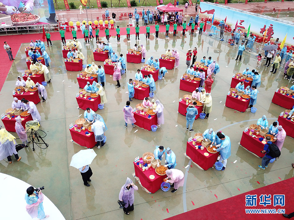 湖南衡東“同剁黃貢椒”成功挑戰(zhàn)基尼斯紀錄 彭斌 攝 表演現(xiàn)場,112組家庭配合默契、動作嫻熟、操作規(guī)范,半個小時,就把560斤三樟黃貢椒、560斤米酒、112斤食鹽制成了112壇黃燦燦的“三樟黃剁椒”,充分展示了衡東地方特色、民俗風(fēng)情以及衡東人民熱愛勞動、尊老愛幼、崇尚中華傳統(tǒng)美德的精神風(fēng)貌。 -