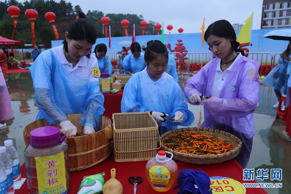 湖南衡東“同剁黃貢椒”成功挑戰(zhàn)基尼斯紀錄 陳新星 攝 參加當天剁椒表演的共有112組家庭,每組由3名家庭成員組成,來自全縣各行各業(yè),年齡最大的65歲、最小的僅6歲。剁椒所使用的菜刀、木桶、竹籃、蔑篩等工具全部由當?shù)孛耖g匠人按傳統(tǒng)工藝手工制作;大家按照傳統(tǒng)的“備椒、洗椒、碼椒、剁椒、腌椒、貯椒、封壇”七個步驟有序進行。