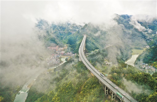 3月29日,婁懷高速公路溆浦縣三江特大橋處,云霧匯聚,山水交融,各種車輛南來北往穿梭于雪峰山脈,推動大湘西地區(qū)經(jīng)濟社會加快發(fā)展。