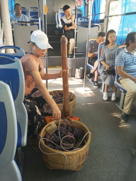 △公交車?yán)锍33蔀橐环叫√斓兀加鎏羝咸褤?dān)子的乘客。