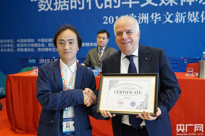 卡羅·卡普里亞代表總理府為舒勇頒獎(jiǎng)(央廣網(wǎng)發(fā) 主辦方提供圖片)