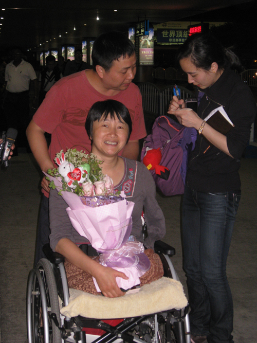 各位聽眾,我是華夏之聲記者孫洋,汶川特大地震三周年到來之際,我們?cè)诔啥茧p流機(jī)場(chǎng)迎來了剛從馬來西亞推廣殘疾人羌繡產(chǎn)品歸來的黃莉。