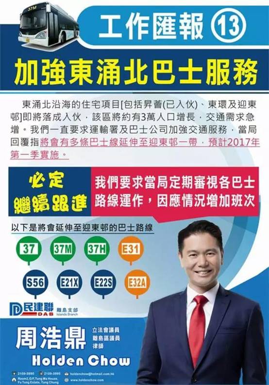 周:這么多年以來(lái),在東涌的議題中,我們最重視的是交通問題。在過去的一屆,對(duì)于東涌,我們聚焦在新市鎮(zhèn)規(guī)劃上,現(xiàn)在看來(lái),我們都是一直跟進(jìn)著。第一,例如在東涌方面的市鎮(zhèn)公園的規(guī)劃。前一陣子我和政府開會(huì),希望這個(gè)公園能夠建設(shè)成一個(gè)環(huán)境優(yōu)美、優(yōu)化空氣的空間,讓東涌的居民能夠享受到一個(gè)好的綠色空間。我們一直和政府溝通,不斷提出我們的意見,希望這個(gè)公園最后能夠建成。另外就是交通問題。就現(xiàn)在的情況來(lái)看,東涌的交通問題一直沒有解決,如果按照預(yù)測(cè),東涌的人口將來(lái)會(huì)達(dá)到二十八萬(wàn),按照現(xiàn)在的交通道路等設(shè)施,青馬大橋或者鐵路設(shè)施等,沒有任何的改造升級(jí)、優(yōu)化,我相信是根本解決不了這個(gè)交通問題的,所以我們也會(huì)一直督促政府的。