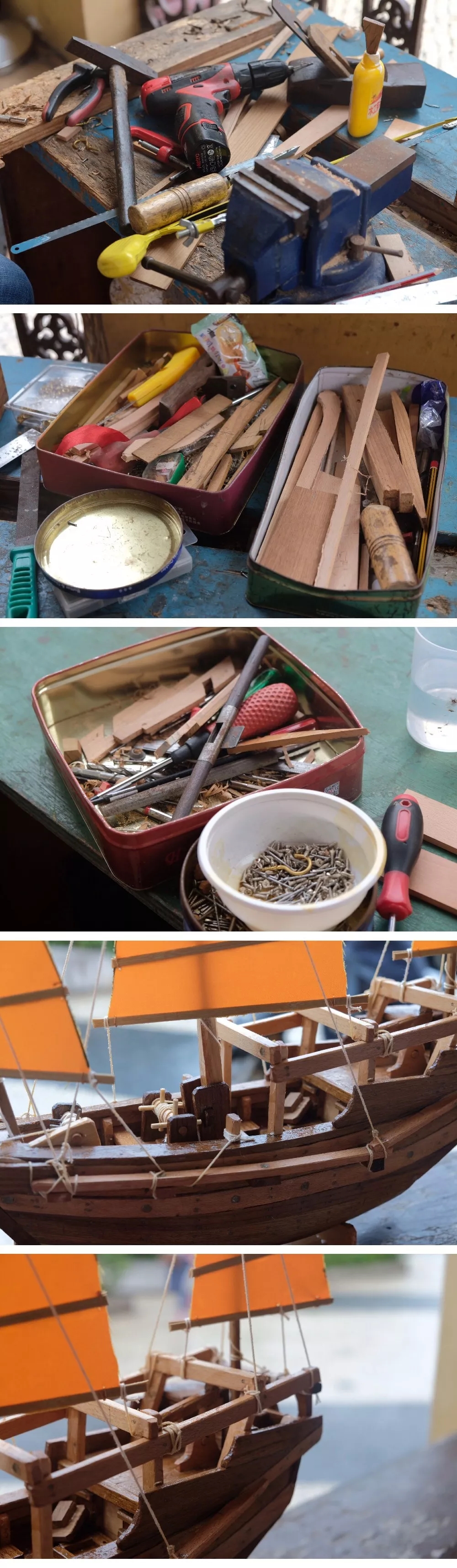 如今澳門(mén)造船業(yè)式微,時(shí)代使然,人縱無(wú)奈,仍可堅(jiān)持。資深造船工匠溫泉以大船細(xì)作的模式,運(yùn)用其記憶、經(jīng)驗(yàn)和手藝,制作出多艘逼真帆船模型,展現(xiàn)瀕臨消失的造船工藝。