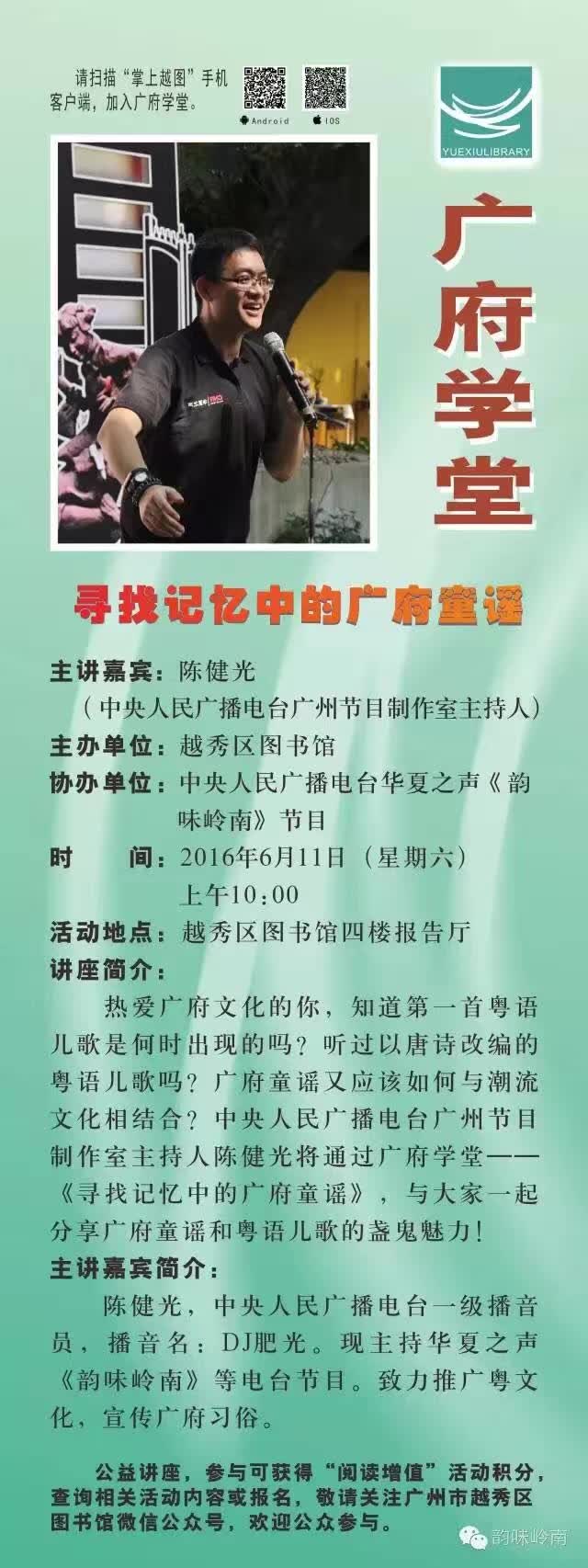 (央廣記者陳健光文、泡泡小魚(yú)ss圖)今年端午假期的最后一天(6月11日),廣州越秀區(qū)圖書(shū)館舉辦了“廣府學(xué)堂”系列講座,主題是“尋找記憶中的廣府童謠”。本期活動(dòng)邀請(qǐng)了來(lái)自中央人民廣播電臺(tái)廣州節(jié)目制作室的主持人陳健光(DJ肥光)主講,活動(dòng)吸引了近兩百名讀者和聽(tīng)眾參與。