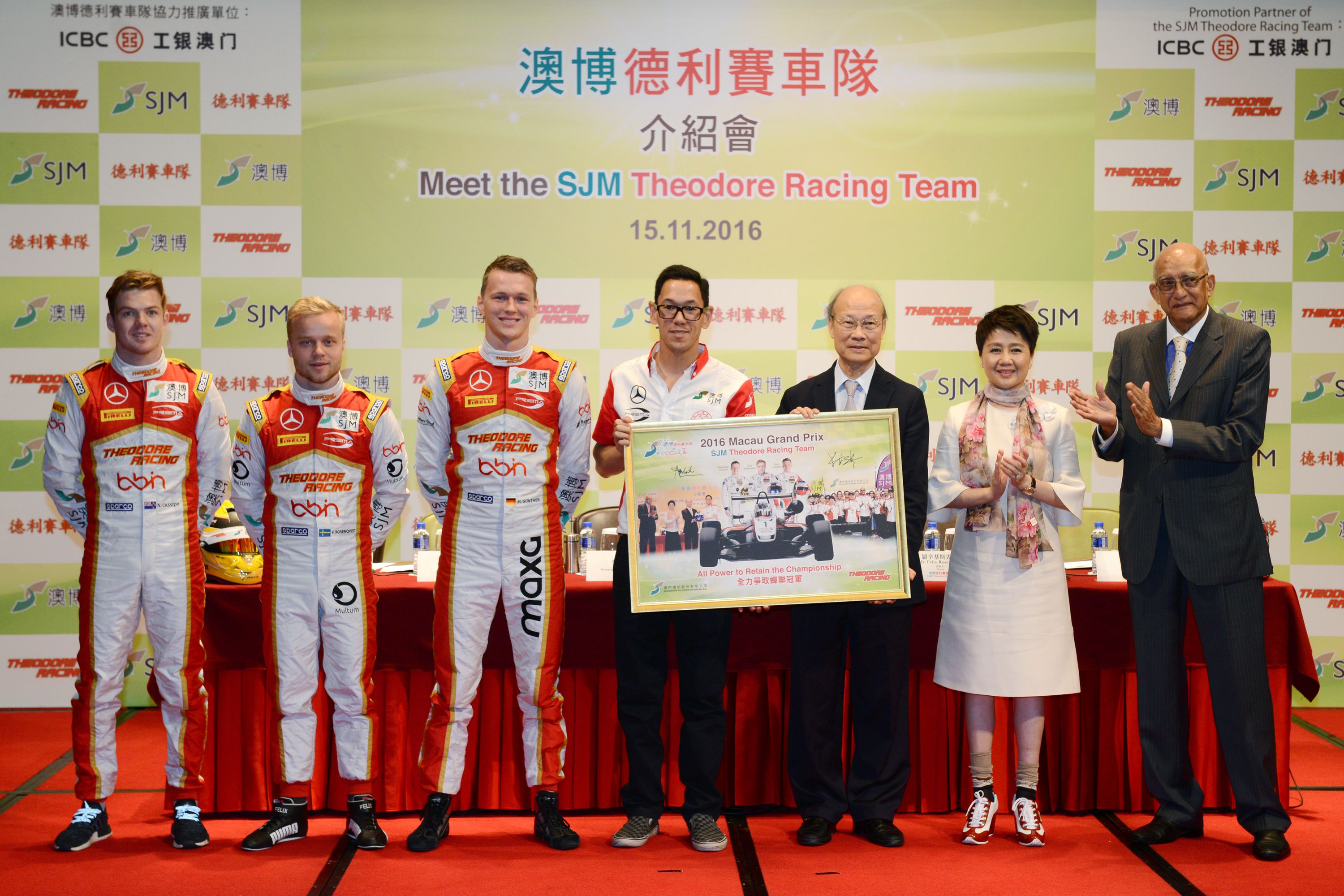 出席介紹會(huì)的包括澳博董事局主席蘇樹輝博士、常務(wù)董事兼行政總監(jiān)梁安琪女士、車隊(duì)總監(jiān)小葉德利先生、三位賽車手羅辛基斯先生、根拿先生以及卡斯德先生。