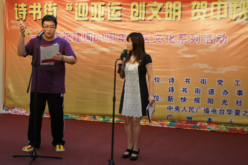 “我考下你,你知唔知詩書街里頭有條福地巷。俊薄肮V!倫文敘我同你講一講,以前佢就住福地巷,威水往事無處藏,一門四元都喺狀元郎!狀元郎……”主持人肥光的這段有趣的快板粵語開場白,一下子把讀者朋友與市民街坊帶進了“玩轉廣州古街巷”活動中,而藝術家們的輪番表演,也令大家飽饗本土文化大餐。
