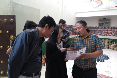 記者李姝含(中)采訪黑陶技藝傳承人白馬群加(右一)