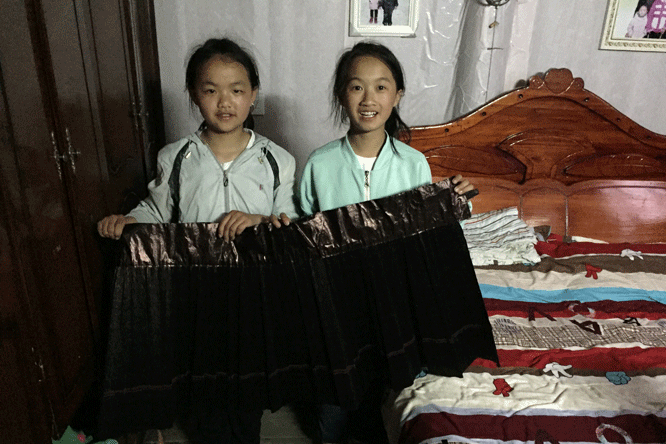 王奕(右)、王雅嫻(左)姐妹倆展示長(zhǎng)輩為她們制作的裙裝