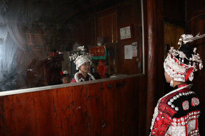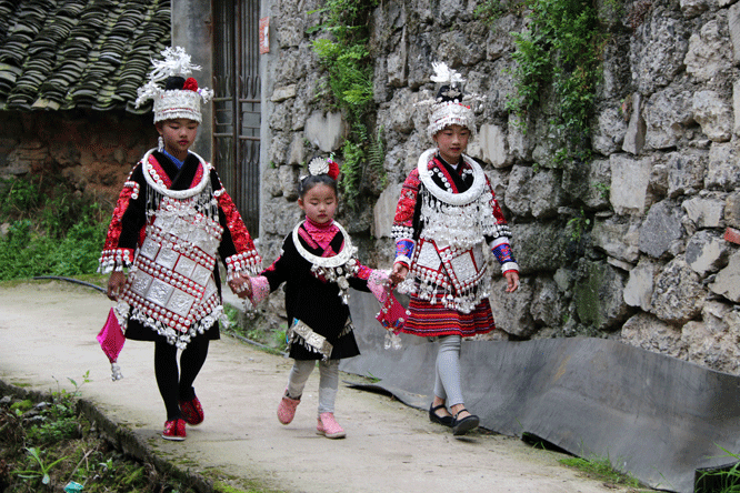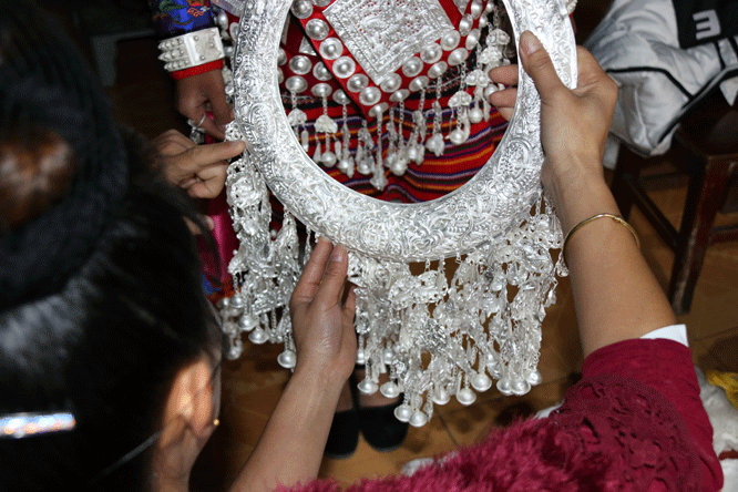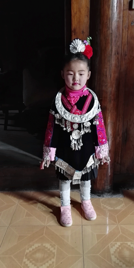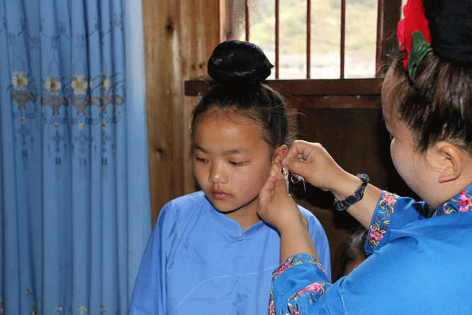 苗族的傳統(tǒng)服飾繁縟厚重,小姑娘要在長(zhǎng)輩的協(xié)助下才能穿戴好。