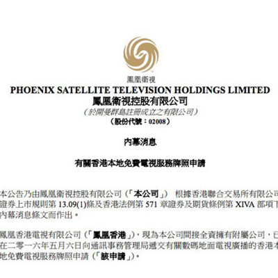 通訊局就鳳凰香港的申請,9月23日在憲報及兩份本地報章刊登公告。通訊局表示,于今年5月6日收到鳳凰香港的免費電視牌照申請,并于6月至9月期間收到鳳凰香港提交的補充資料。通訊局公布的文件顯示,鳳凰香港現(xiàn)時是鳳凰衛(wèi)視(香港臺)有限公司全資附屬公司,其母公司為鳳凰衛(wèi)視,鳳凰香港呈述將會在營運首六年所需經(jīng)費估計合共為23.74億元,當(dāng)中6.23億元用于節(jié)目開支、1.31億元為資本開支,以及16.2億元為營運開支,而鳳凰控股會在財政上全力支持鳳凰香港的投資及營運。