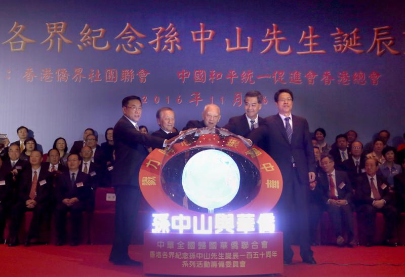 香港各界紀念孫中山先生誕辰150周年大會昨天(16日)在香港會議展覽中心舉行。海峽兩岸暨港澳地區(qū)的社會各界代表、孫中山后人親屬以及海外嘉賓約1200人出席。