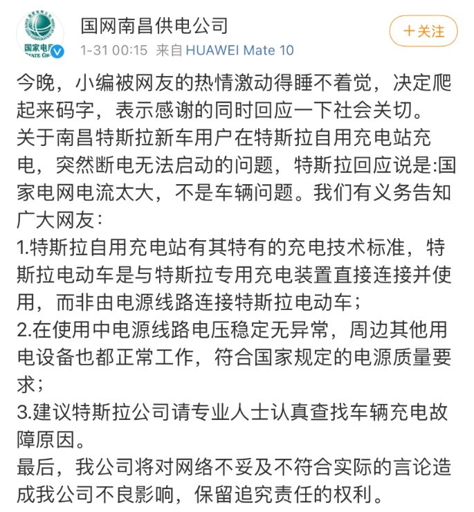1月31日凌晨,國網(wǎng)南昌供電公司發(fā)表微博稱,特斯拉自用充電站有其特有的充電技術(shù)標(biāo)準(zhǔn),特斯拉電動車是與特斯拉專用充電裝置直接連接并使用,而非由電源線路連接特斯拉電動車;在使用中電源線路電壓穩(wěn)定無異常,周邊其他用電設(shè)備也都正常工作,符合國家規(guī)定的電源質(zhì)量要求;建議特斯拉公司請專業(yè)人士認(rèn)真查找車輛充電故障原因。