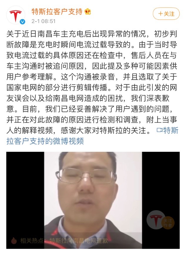 面對國家電網(wǎng)的回應(yīng),2月1日,“特斯拉客戶支持”發(fā)表微博稱,“對于由此引發(fā)的網(wǎng)友誤會以及給南昌電網(wǎng)造成的困擾,我們深表歉意。目前,我們已經(jīng)妥善解決了用戶遇到的問題,并正在對此故障的原因進(jìn)行檢測和調(diào)查!