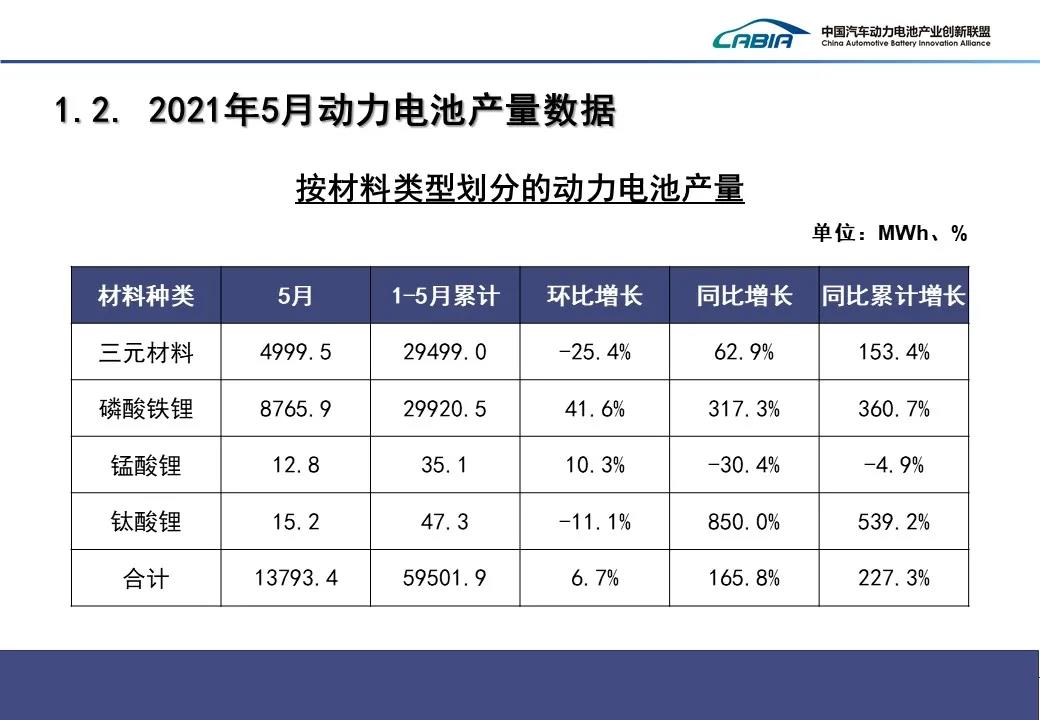 1-5月,我國(guó)動(dòng)力電池產(chǎn)量累計(jì)59.5GWh,同比累計(jì)增長(zhǎng)227.3%。其中三元電池產(chǎn)量累計(jì)29.5GWh,占總產(chǎn)量49.6%,同比累計(jì)增長(zhǎng)153.4%;磷酸鐵鋰電池產(chǎn)量累計(jì)29.9GWh,占總產(chǎn)量50.3%,同比累計(jì)增長(zhǎng)360.7%。