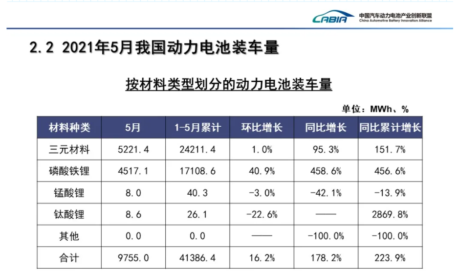 1-5月,我國(guó)動(dòng)力電池裝車量累計(jì)41.4GWh,同比累計(jì)上升223.9%。其中三元電池裝車量累計(jì)24.2GWh,占總裝車量58.5%,同比累計(jì)上升151.7%;磷酸鐵鋰電池裝車量累計(jì)17.1GWh,占總裝車量41.3%,同比累計(jì)上升456.6%。