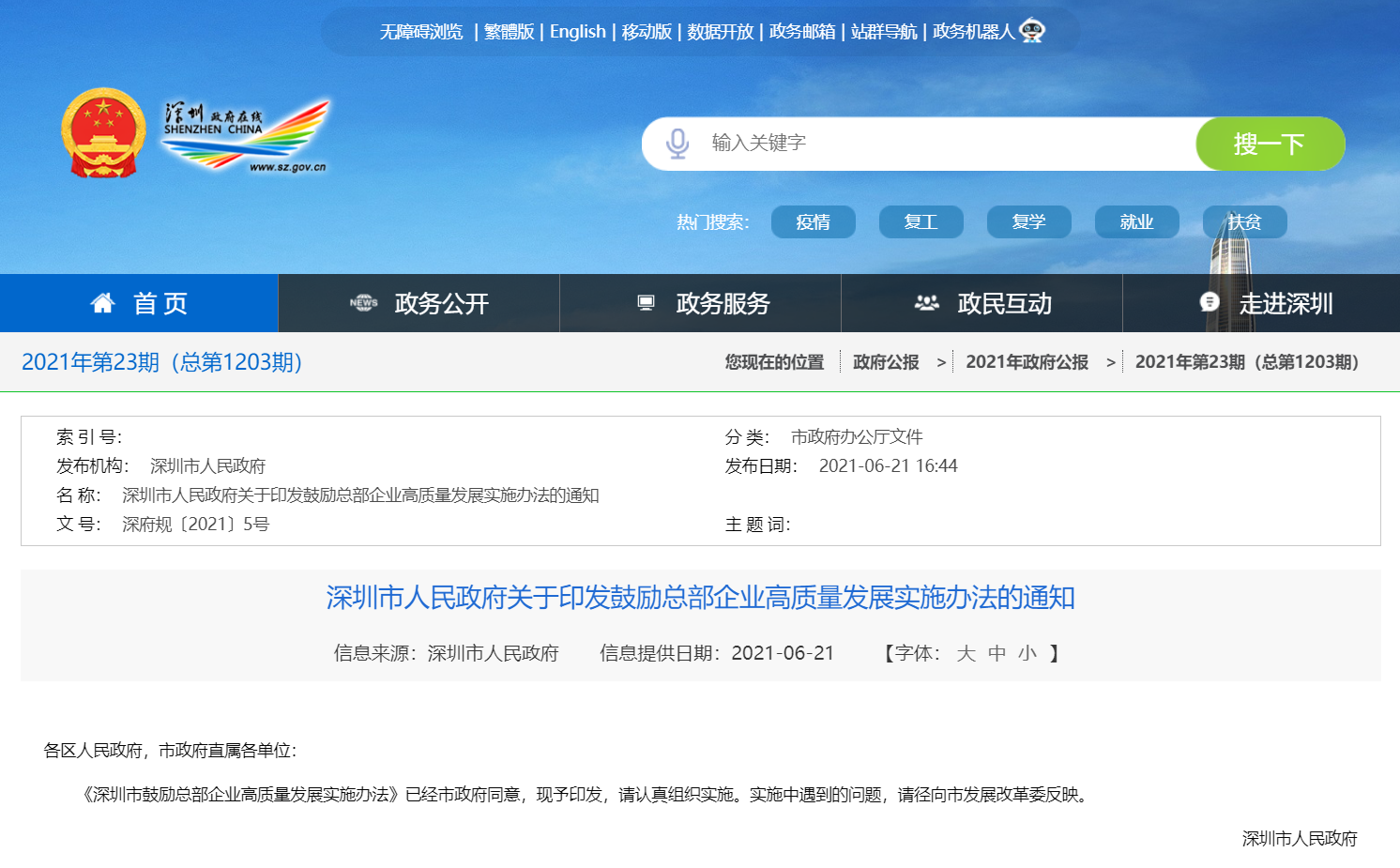 央廣網(wǎng)北京6月24日消息(記者 萬玉航)深圳市近日印發(fā)《深圳市鼓勵總部企業(yè)高質(zhì)量發(fā)展實施辦法》(下稱《實施辦法》),提出十三條總部企業(yè)支持政策。在深設(shè)立的總部企業(yè),符合一定條件可享落戶獎、貢獻獎、租房與購房補助等多項支持。