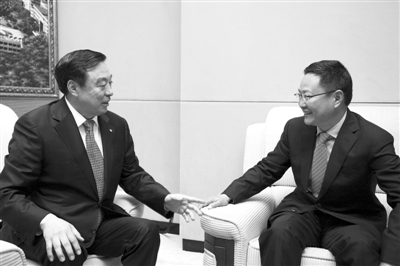 昨日,田惠宇(右)正式當(dāng)選招行行長。近日,“前任行長”馬蔚華(左)與“接班人”田惠宇在一起“愉快交談”。 資料圖:招行提供