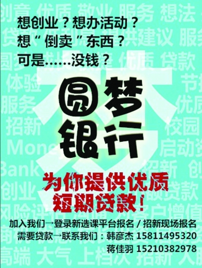 在借貸流程上,“圓夢銀行”自有一套規(guī)矩以規(guī)避風(fēng)險(xiǎn)。其“放款”流程大致是:學(xué)生客戶致電“圓夢銀行”后,“銀行”會(huì)馬上派人會(huì)見客戶→了解貸款目的及金額→填寫、提交貸款申請表→風(fēng)險(xiǎn)評估(還款能力等)→協(xié)商還款日期及利息等事項(xiàng)→擬定合同→簽訂合同(一式三份,包括還款期限、利息、罰金等說明)→發(fā)放貸款→定期檢查營業(yè)、盈利情況→收回貸款。據(jù)韓明“行長”介紹,流程里對于借貸風(fēng)險(xiǎn)的評估,主要是依靠他們自身的經(jīng)濟(jì)判斷能力,需要判斷學(xué)生社團(tuán)的規(guī)模如何、盈利性何在,如果是非盈利性社團(tuán),還需要考慮到他們的還錢渠道。經(jīng)過風(fēng)險(xiǎn)評估后,他們才敢將錢借出。除了社團(tuán),他們也為個(gè)人提供借貸。在個(gè)人借貸方面,為了保證還款,“圓夢銀行”今年加入了個(gè)人借款物品抵押的保障政策,“前陣子有個(gè)同學(xué)要借300元錢買U盤,就在我們這兒抵押了一個(gè)移動(dòng)硬盤。”