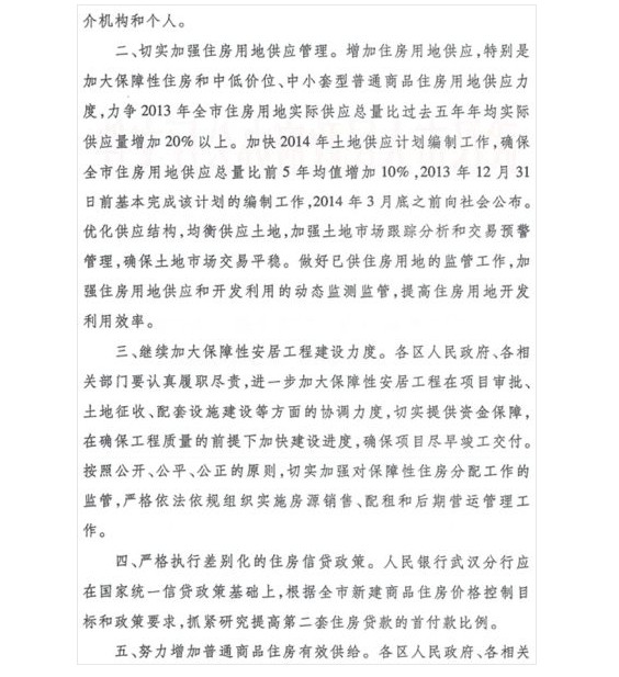 武漢提出堅(jiān)決抑制投資投機(jī)性住房需求,調(diào)整非本市戶籍居民家庭購(gòu)房納稅或繳納社保年限,由一年調(diào)整為兩年,并僅限一套住房;加大土地用地供應(yīng)管理;加大保障房建設(shè)和供應(yīng);增加普通商品房供給;加大市場(chǎng)監(jiān)管力度。而對(duì)于市場(chǎng)上傳得沸沸揚(yáng)揚(yáng)的提高二套房首付,本次新政策文件中并未具體說(shuō)明,只是說(shuō)抓緊時(shí)間研究。