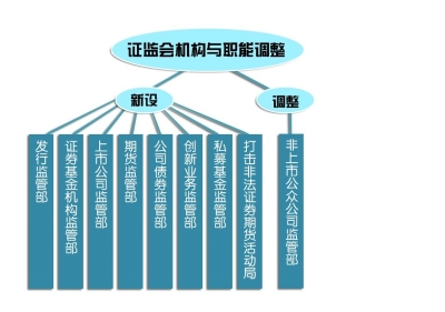 根據(jù)證監(jiān)會新聞發(fā)言人介紹,證監(jiān)會此次調(diào)整的發(fā)行監(jiān)管部等9個部門主要包括,成立新的發(fā)行監(jiān)管部、新的上市公司監(jiān)管部、新的期貨監(jiān)管部,設(shè)立公司債券監(jiān)管部、創(chuàng)新業(yè)務(wù)監(jiān)管部、私募基金監(jiān)管部、設(shè)立打擊非法證券期貨活動局(清理整頓各類交易場所辦公室),以及非上市公眾公司監(jiān)管部。