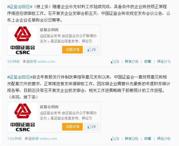 對此,證監(jiān)會官方微博回應(yīng)稱,“因在審企業(yè)需要補(bǔ)充最新的年度財(cái)務(wù)審計(jì)報(bào)告等,目前尚沒有召開首發(fā)企業(yè)的發(fā)審會,相關(guān)工作進(jìn)展略晚于前期預(yù)計(jì)的工作進(jìn)程。”這也就是說,媒體報(bào)道的IPO發(fā)審會最快將于下周召開并不準(zhǔn)確。
