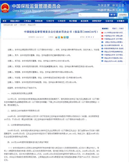 安華農(nóng)險(xiǎn)也為這11起違規(guī)付出了代價(jià)。保監(jiān)會(huì)給予安華農(nóng)險(xiǎn)警告、限制除銀行存款以外的其它資金運(yùn)用范圍6個(gè)月、罰款80萬元的處罰;責(zé)令撤換董事吳術(shù)、董事鄭萬起,以及副總經(jīng)理、財(cái)務(wù)負(fù)責(zé)人、董事會(huì)秘書鄭克國(guó)。