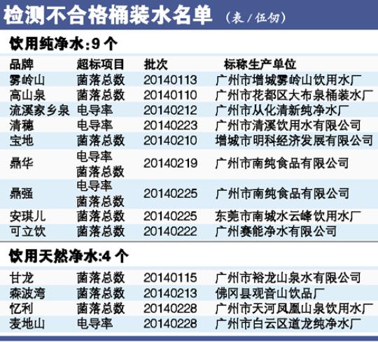 13批次不合格的桶裝飲用水中,有11批次被發(fā)現(xiàn)菌落總數(shù)超標(biāo),其中廣州市裕龍山泉水有限公司生產(chǎn)的甘龍牌飲用天然凈水,菌落超標(biāo)高達(dá)3100倍。其余菌落超標(biāo)的桶裝水,超標(biāo)范圍也在6倍~29倍之間。