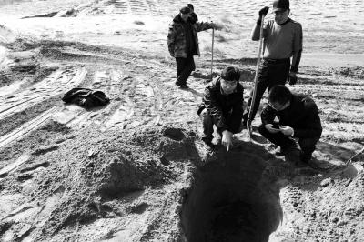 環(huán)保專家組成員在甘肅武威境內(nèi)的騰格里沙漠受污染地點深挖探坑調(diào)查取樣。