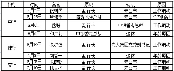 4月2日,中行發(fā)公告稱(chēng),祝樹(shù)民因工作調(diào)動(dòng)原因辭去中行副行長(zhǎng)職務(wù)。在過(guò)去的3月份,已有3名中行高管離職,岳毅辭去中行副行長(zhǎng)職務(wù),接替因年齡原因退休的中銀香港副董事長(zhǎng)兼總裁的和廣北。而中行薪酬最高的信貸風(fēng)險(xiǎn)總監(jiān)詹偉堅(jiān)因任期屆滿離職。