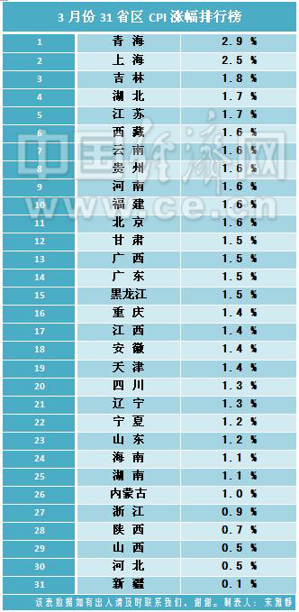 在中國經(jīng)濟(jì)網(wǎng)記者制作的3月份31省區(qū)CPI同比漲幅排行榜中,可以清晰的看到,青海、上海、吉林居前三位,其中青海CPI同比漲2.9%為全國最高,上海同比上漲2.5%位居第二,吉林同比漲1.8%居第三,此外新疆僅上漲0.1%,繼續(xù)處在全國最末位。值得注意的是,處于第一及倒數(shù)第一的青海和新疆CPI漲幅在3月均環(huán)比下降!