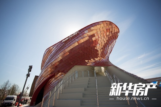 萬科館由國際著名建筑師、紐約世貿(mào)中心重建總規(guī)劃師丹尼爾 里伯斯金設(shè)計,理念出自中國傳統(tǒng)山水畫以及梯田這一農(nóng)業(yè)符號,外部4000塊紅色陶板在陽光照射下仿佛鱗片,整個建筑似盤龍一般,蘊含了農(nóng)耕社會祈求風調(diào)雨順、豐衣足食的寓意。