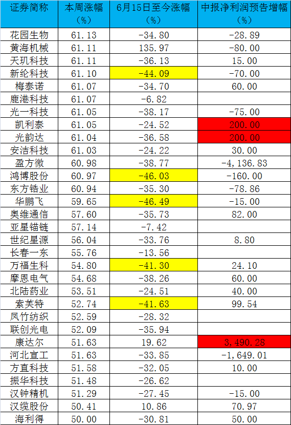 統(tǒng)計數(shù)據(jù)顯示,本周A股共2058只個股上漲,169只個股超過30%,漲幅超過20%的個股也有400只。剔除年內(nèi)上市的公司,部分本周漲幅靠前個股跌幅仍較大,后市值得重點關(guān)注。