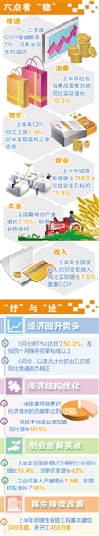 “上半年經(jīng)濟(jì)運(yùn)行緩中趨穩(wěn),穩(wěn)中向好,穩(wěn)中有進(jìn)。”國(guó)家發(fā)展改革委秘書(shū)長(zhǎng)李樸民說(shuō),“穩(wěn)”主要表現(xiàn)在六個(gè)方面,一是增速穩(wěn)。上半年GDP增長(zhǎng)7%,與全年的預(yù)期目標(biāo)一致,而且一、二季度這兩個(gè)季度的增速都是7%,沒(méi)有出現(xiàn)大的波動(dòng);二是消費(fèi)穩(wěn)。上半年社會(huì)消費(fèi)品零售總額同比實(shí)際增長(zhǎng)10.5%;三是物價(jià)穩(wěn)。上半年居民消費(fèi)價(jià)格同比上漲1.3%,總體呈現(xiàn)溫和上漲態(tài)勢(shì);四是就業(yè)穩(wěn)。上半年城鎮(zhèn)新增就業(yè)718萬(wàn)人,完成全年目標(biāo)的71.8%;五是農(nóng)業(yè)穩(wěn)。全國(guó)夏糧總產(chǎn)量比去年增加了447萬(wàn)噸,增長(zhǎng)3.3%;六是收入穩(wěn)。上半年全國(guó)居民人均可支配收入同比實(shí)際增長(zhǎng)7.6%,繼續(xù)快于GDP增速。