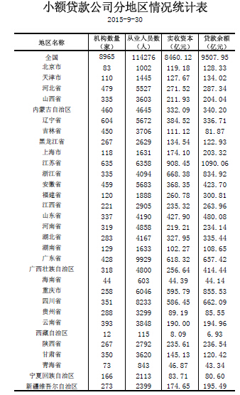 央廣網(wǎng)財經(jīng)10月23日消息 中國人民銀行23日發(fā)布《2015年三季度小額貸款公司統(tǒng)計數(shù)據(jù)報告》,稱,截至2015年9月末,全國共有小額貸款公司8965家,貸款余額9508億元,前三季度新增人民幣貸款76億元。在全國8965家小額貸款公司中,江蘇有635家,居全國首位;廣東省從業(yè)人員數(shù)則為9929,為全國最多。