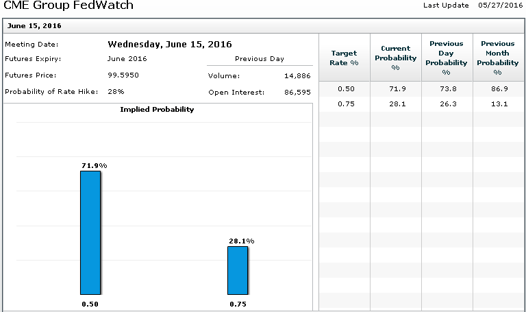 央廣網(wǎng)財經(jīng)5月30日消息 近日,美聯(lián)儲主席耶倫“鷹派”的表態(tài)令市場加息預(yù)期躥升。截止27日,據(jù)美國聯(lián)邦基金利率期貨,聯(lián)儲六月加息的概率達28.1%,七月則達到了60.7%。