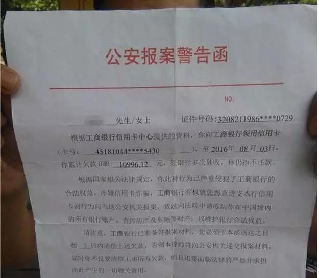 楊女士接到一份銀行聘用律師發(fā)來的公安報案警告函,告知她名下信用卡欠款10996.12元。警告函稱,必須在3日內(nèi)清償上述欠款,否則就會向公安機關(guān)遞交報案材料。