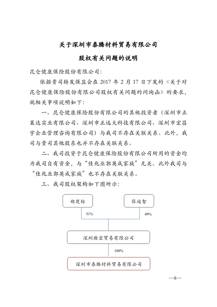 2017年2月24日,我會(huì)收到昆侖健康保險(xiǎn)股份有限公司報(bào)來(lái)的《關(guān)于昆侖健康保險(xiǎn)股份有限公司股權(quán)有關(guān)問(wèn)題的報(bào)告》(昆侖字〔2017〕51號(hào)),F(xiàn)請(qǐng)昆侖健康保險(xiǎn)股份有限公司及有關(guān)股東就下述問(wèn)題作出進(jìn)一步解釋和說(shuō)明: