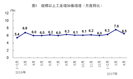4月份,全國規(guī)模以上工業(yè)增加值同比實際增長6.5%,增速比上月回落1.1個百分點,比上年同月加快0.5個百分點。分經(jīng)濟類型看,國有控股企業(yè)增加值同比增長5.6%,集體企業(yè)增長1.9%,股份制企業(yè)增長6.9%,外商及港澳臺商投資企業(yè)增長5.5%。分三大門類看,采礦業(yè)增加值同比下降0.4%,制造業(yè)增長6.9%,電力、熱力、燃氣及水生產(chǎn)和供應(yīng)業(yè)增長7.8%。工業(yè)結(jié)構(gòu)繼續(xù)優(yōu)化,高技術(shù)產(chǎn)業(yè)和裝備制造業(yè)增加值同比分別增長12.3%和10.3%,增速分別比規(guī)模以上工業(yè)快5.8和3.8個百分點。規(guī)模以上工業(yè)企業(yè)產(chǎn)銷率達到97.6%。從環(huán)比看,4月份全國規(guī)模以上工業(yè)增加值比上月增長0.56%。1-4月份,全國規(guī)模以上工業(yè)增加值同比增長6.7%。