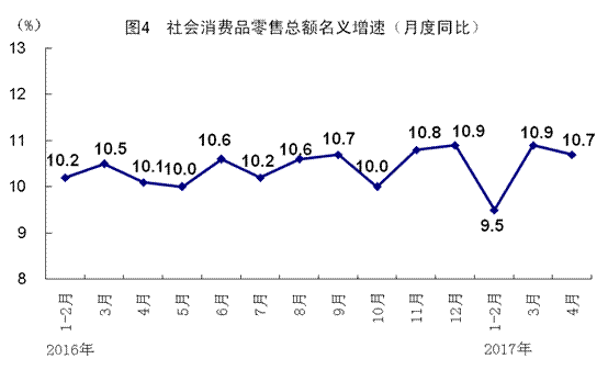 4月份,社會消費品零售總額27278億元,同比增長10.7%,增速比上月回落0.2個百分點,比上年同月加快0.6個百分點。按經(jīng)營單位所在地分,城鎮(zhèn)消費品零售額23483億元,同比增長10.4%;鄉(xiāng)村消費品零售額3795億元,增長12.6%。按消費類型分,餐飲收入2886億元,同比增長11.1%;商品零售24393億元,增長10.6%,其中限額以上單位商品零售11532億元,增長9.3%。從環(huán)比看,4月份社會消費品零售總額比上月增長0.79%。1-4月份,社會消費品零售總額同比增長10.2%。