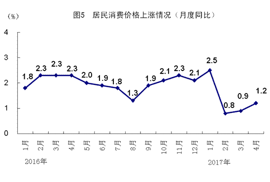 4月份,全國居民消費價格同比上漲1.2%,漲幅比上月擴大0.3個百分點。分類別看,食品煙酒價格同比下降1.8%,衣著上漲1.3%,居住上漲2.4%,生活用品及服務(wù)上漲0.8%,交通和通信上漲1.8%,教育文化和娛樂上漲2.6%,醫(yī)療保健上漲5.7%,其他用品和服務(wù)上漲3.4%。在食品煙酒價格中,糧食價格上漲1.5%,豬肉價格下降8.1%,鮮菜價格下降21.6%。4月份,居民消費價格環(huán)比上漲0.1%。1-4月份,全國居民消費價格同比上漲1.4%。