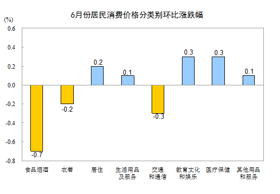 6月份,全國居民消費價格環(huán)比下降0.2%。其中,城市下降0.1%,農(nóng)村下降0.2%;食品價格下降1.0%,非食品價格上漲0.1%;消費品價格下降0.4%,服務(wù)價格上漲0.3%。