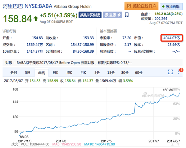 北京時(shí)間8月8日,阿里巴巴股價(jià)報(bào)收158.84美元,市值坐穩(wěn)4000億美元,成為亞洲第一家市值超4000億美元公司,進(jìn)入全球上市公司第一陣營(yíng)。這距阿里巴巴市值突破3000億美元僅僅過(guò)去兩個(gè)多月。
