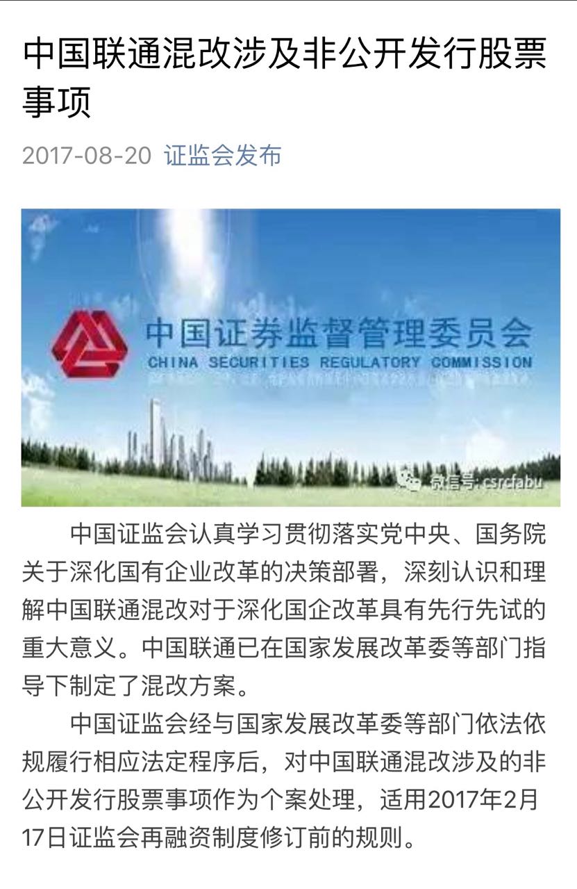 央廣網8月21日消息 20日晚間,中國證監(jiān)會官網就中國聯通混改以及非公開發(fā)行股票一事發(fā)布公告:中國證監(jiān)會經與國家發(fā)展改革委等部門依法依規(guī)履行相應法定程序后,對中國聯通混改涉及的非公開發(fā)行股票事項作為個案處理,適用2017年2月17日證監(jiān)會再融資制度修訂前的規(guī)則。