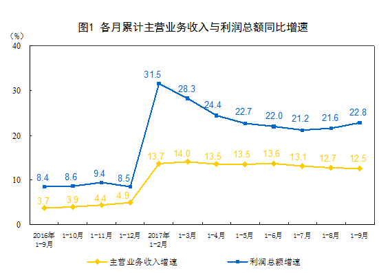 央廣網(wǎng)10月27日消息 國(guó)家統(tǒng)計(jì)局27日發(fā)布的數(shù)據(jù)顯示,2017年1-9月份,全國(guó)規(guī)模以上工業(yè)企業(yè)實(shí)現(xiàn)利潤(rùn)總額55846億元,同比增長(zhǎng)22.8%,增速比1-8月份加快1.2個(gè)百分點(diǎn)。