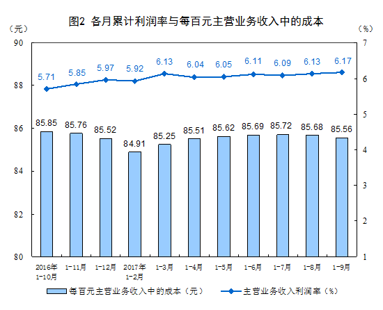 1-9月份,規(guī)模以上工業(yè)企業(yè)實(shí)現(xiàn)主營(yíng)業(yè)務(wù)收入90.5萬(wàn)億元,同比增長(zhǎng)12.5%;發(fā)生主營(yíng)業(yè)務(wù)成本77.4萬(wàn)億元,增長(zhǎng)12.2%;主營(yíng)業(yè)務(wù)收入利潤(rùn)率為6.17%,同比提高0.51個(gè)百分點(diǎn)。