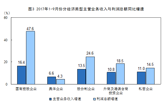 1-9月份,規(guī)模以上工業(yè)企業(yè)中,國(guó)有控股企業(yè)實(shí)現(xiàn)利潤(rùn)總額12577.4億元,同比增長(zhǎng)47.6%;集體企業(yè)實(shí)現(xiàn)利潤(rùn)總額323.4億元,增長(zhǎng)4.3%;股份制企業(yè)實(shí)現(xiàn)利潤(rùn)總額39096.7億元,增長(zhǎng)24.6%;外商及港澳臺(tái)商投資企業(yè)實(shí)現(xiàn)利潤(rùn)總額13514.3億元,增長(zhǎng)18.5%;私營(yíng)企業(yè)實(shí)現(xiàn)利潤(rùn)總額18285.9億元,增長(zhǎng)14.5%。