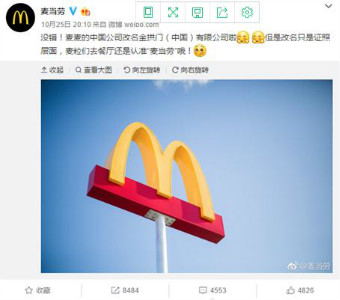 10月25日晚間,麥當勞企業(yè)名稱變更的消息引爆輿論熱潮。工商信息數(shù)據(jù)顯示:10月12日,麥當勞(中國)已正式變更為"金拱門(中國)有限公司"。并就上述名稱變更取得了新的營業(yè)執(zhí)照。而后,麥當勞(中國)證明了這一消息的真實性。