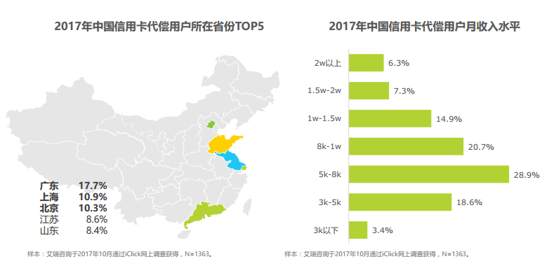 《報(bào)告》顯示,信用卡代償用戶多位于東部經(jīng)濟(jì)和教育發(fā)達(dá)地區(qū),廣東、上海、北京等省市最具代表性。在收入方面,超半數(shù)用戶月收入集中在5000-10000元的范圍內(nèi),收入水平整體較好。